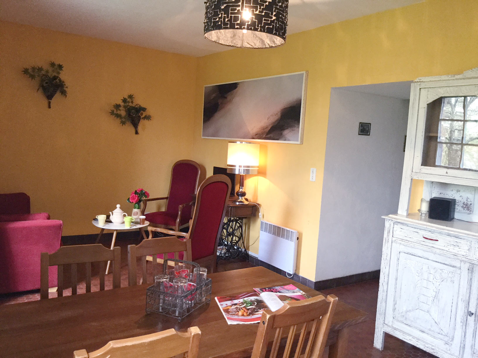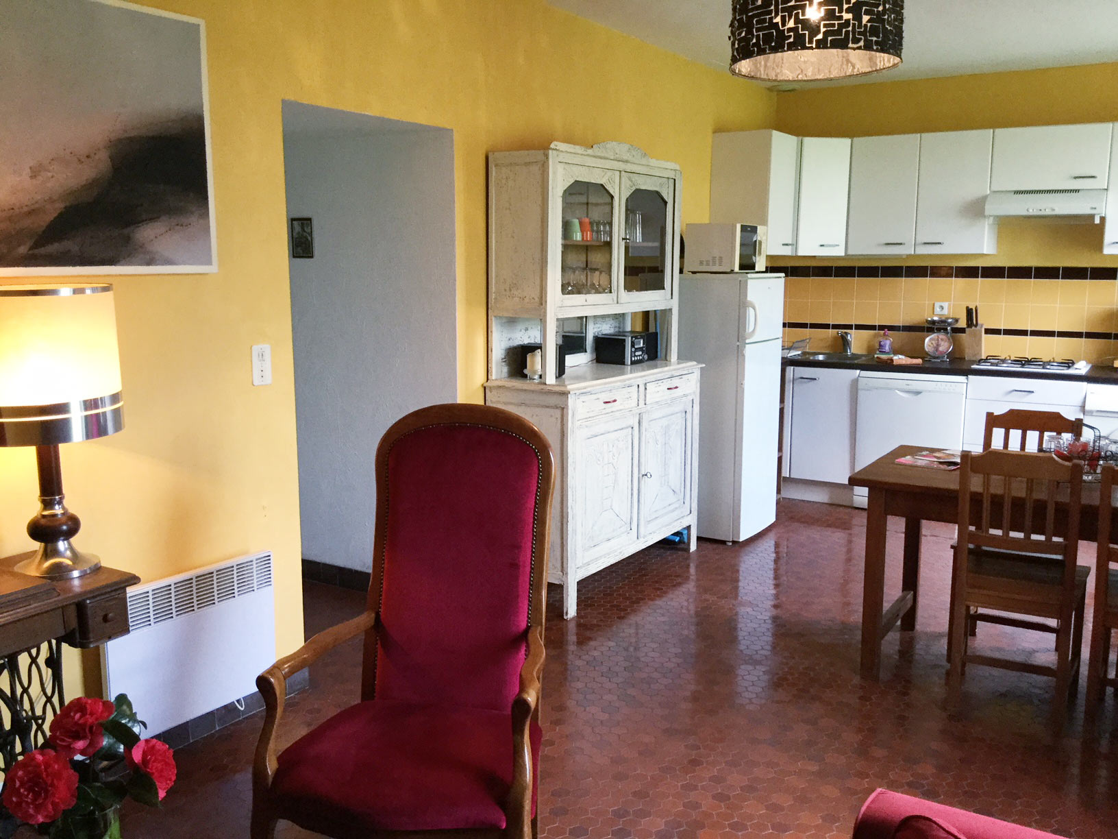 Salon séjour avec cuisine ouverte équipée d’un lave-vaisselle, lave-linge, micro-ondes, mini-four et de nombreux ustensiles de cuisine. Pour le confort de vos petits, une chaise haute est à votre disposition sur demande.