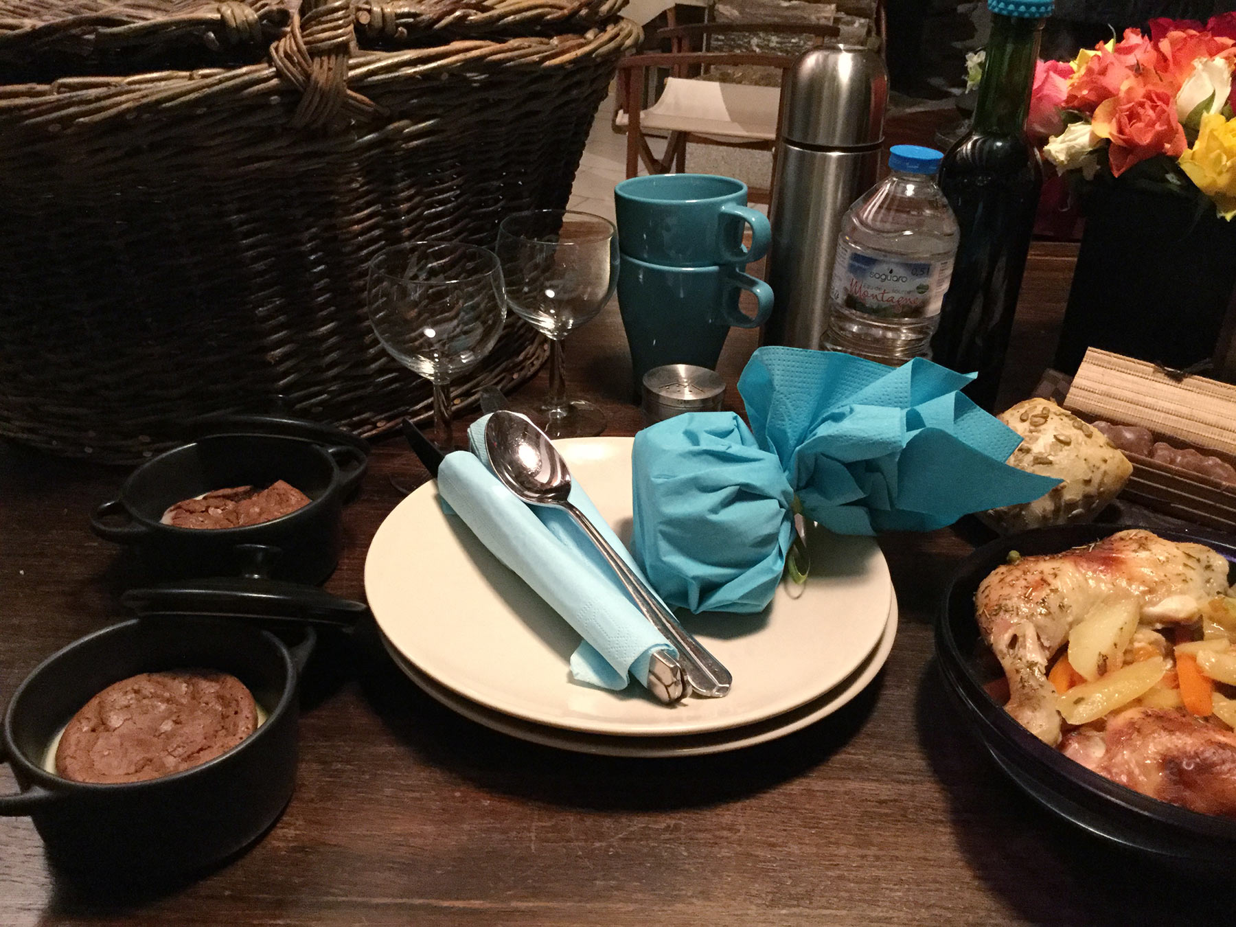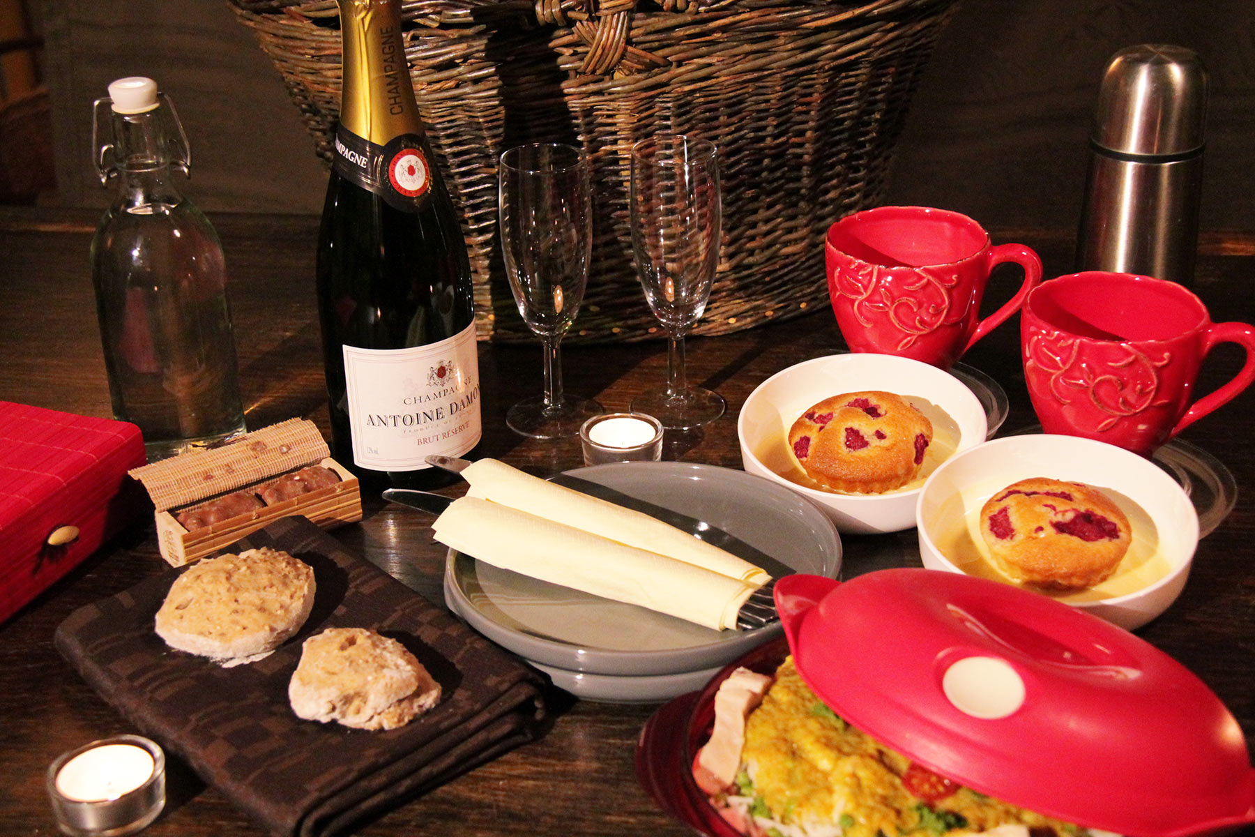 Composé de bouchées apéritives, plat chaud, dessert (faits maison), une bouteille de champage, eau et boisson chaude. Servi au crochet, et à déguster dans votre cabane.